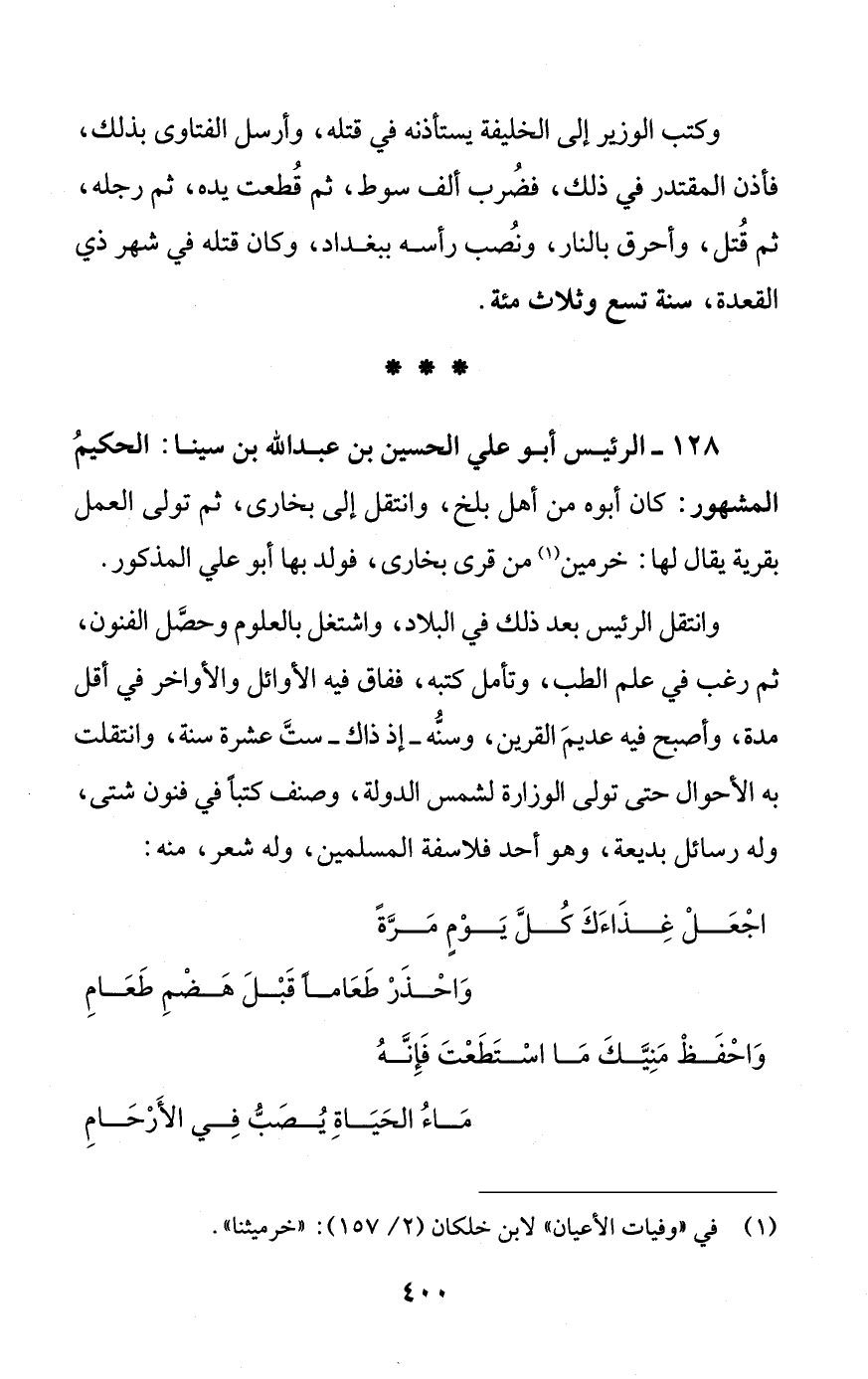 128 - الرئيس أبو علي الحسين بن عبد الله بن سينا: الحكيمُ المشهور: كان أبوه من أهل بلخ، وانتقل إلى بخارى، ثم تولى العمل بقرية يقال لها: خرمين (¬1) من قرى بخارى، فولد بها أبو علي المذكور.