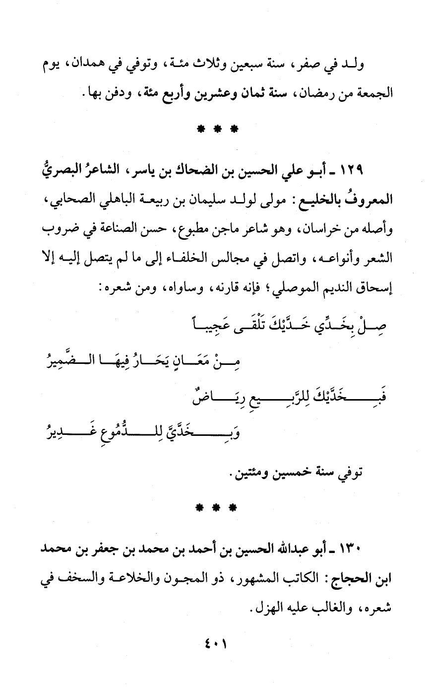 130 - أبو عبد الله الحسين بن أحمد بن محمد بن جعفر بن محمد ابن الحجاج: الكاتب المشهور، ذو المجون والخلاعة والسخف في شعره، والغالب عليه الهزل.
