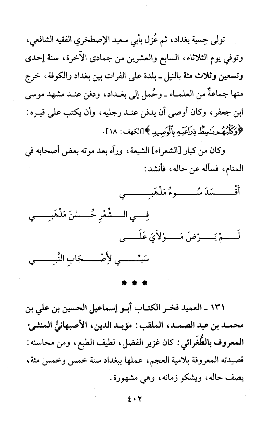 131 - العميد فخر الكتاب أبو إسماعيل الحسين بن علي بن محمد بن عبد الصمد، الملقب: مؤيد الدين، الأصبهانيُّ المنشئ المعروف بالطُّغَرائي: كان غزير الفضل، لطيف الطبع، ومن محاسن: قصيدته المعروفة بلامية العجم، عملها ببغداد سنة خمس وخمس مئة، يصف حاله، ويشكو زمانه، وهي مشهورة.