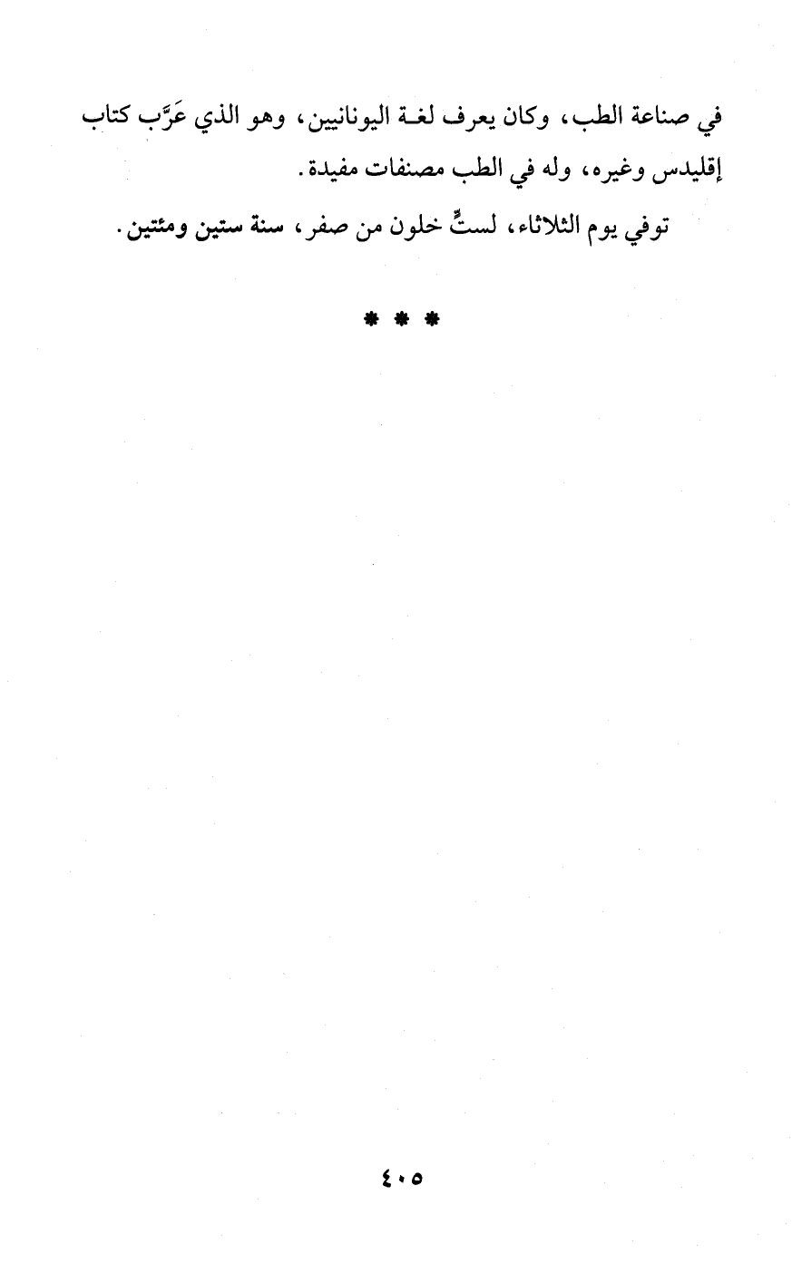 في صناعة الطب، وكان يعرف لغة اليونانيين، وهو الذي عَرَّب كتاب إقليدس وغيره، وله في الطب مصنفات مفيدة.