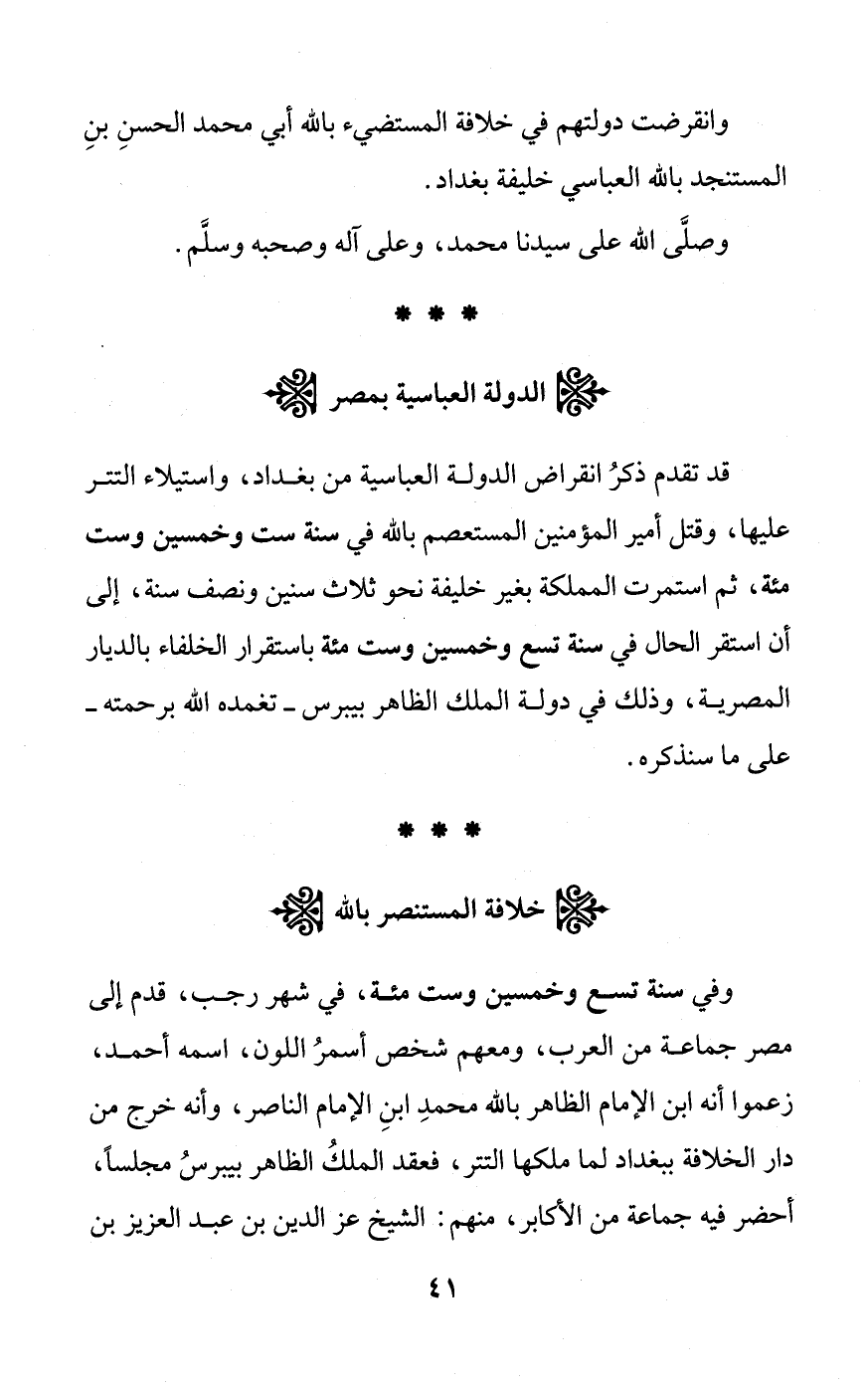 قد تقدم ذكرُ انقراض الدولة العباسية من بغداد، واستيلاء التتر عليها، وقتل أمير المؤمنين المستعصم بالله في سنة ست وخمسين وست مئة، ثم استمرت المملكة بغير خليفة نحو ثلاث سنين ونصف سنة، إلى أن استقر الحال في سنة تسع وخمسين وست مئة باستقرار الخلفاء بالديار المصرية، وذلك في دولة الملك الظاهر بيبرس - تغمده الله برحمته - على ما سنذكره.