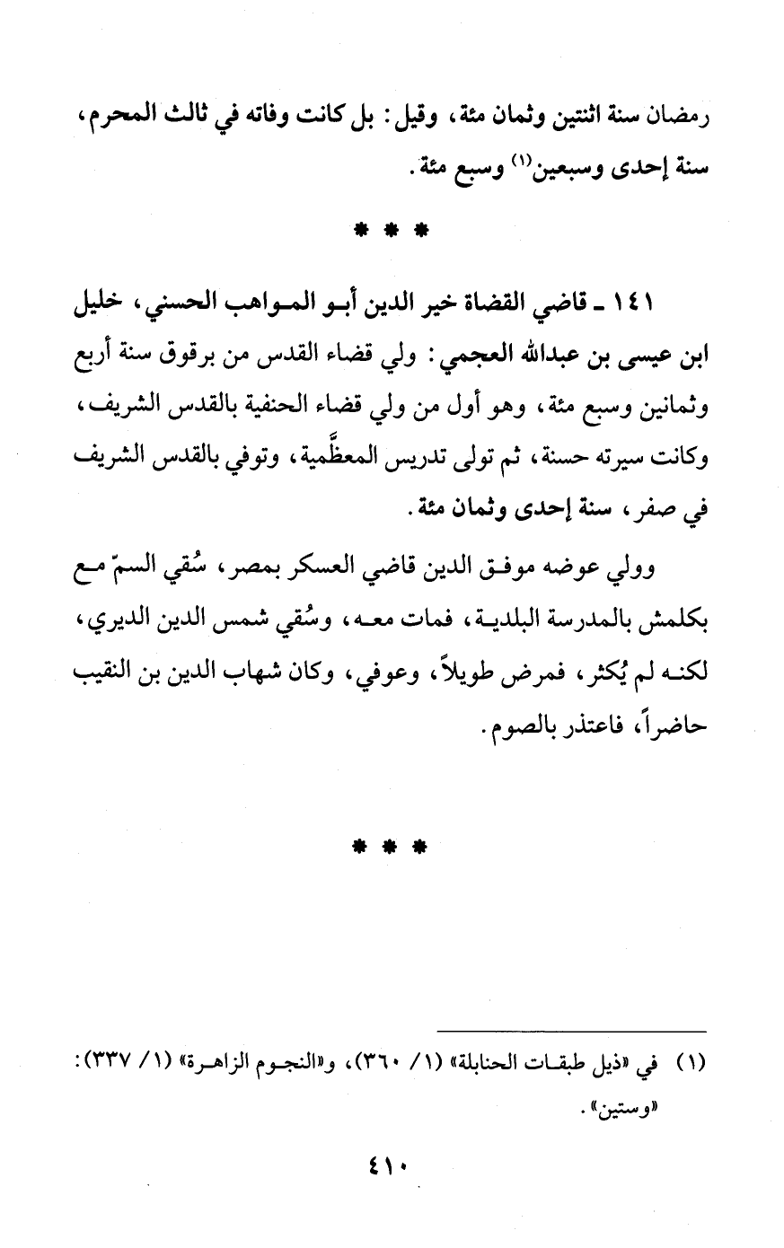 141 - قاضي القضاة خير الدين أبو المواهب الحسني، خليل ابن عيسى بن عبد الله العجمي: ولي قضاء القدس من برقوق سنة أربع وثمانين وسبع مئة، وهو أول من ولي قضاء الحنفية بالقدس الشريف، وكانت سيرته حسنة، ثم تولى تدريس المعظَّمية، وتوفي بالقدس الشريف في صفر، سنة إحدى وثمان مئة.