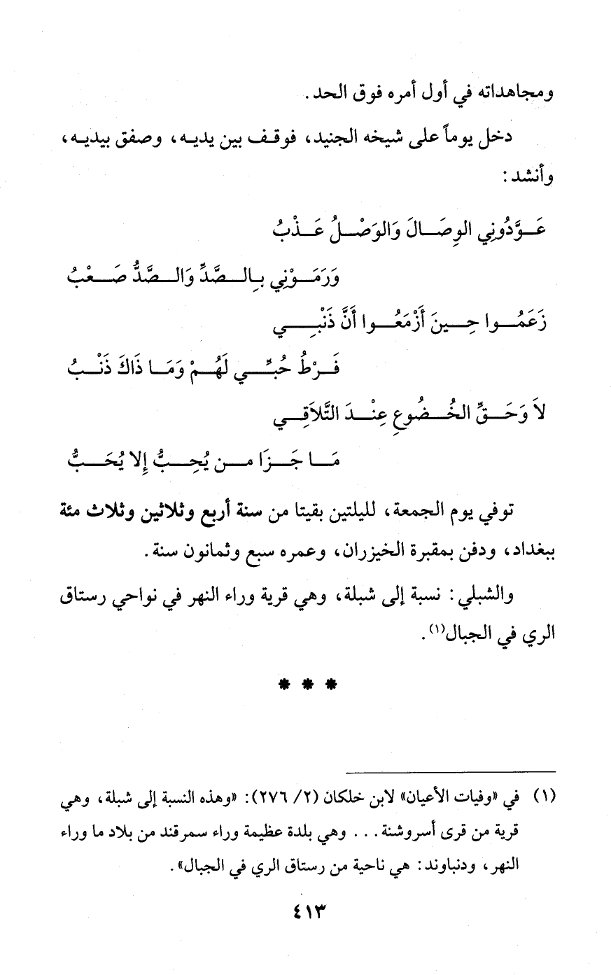 (¬1) في "وفيات الأعيان" لابن خلكان (2/ 276): "وهذه النسبة إلى شبلة، وهي قرية من قرى أسروشنة ... وهي بلدة عظيمة وراء سمرقند من بلاد ما وراء النهر، ودنباوند: هي ناحية من رستاق الري في الجبال".