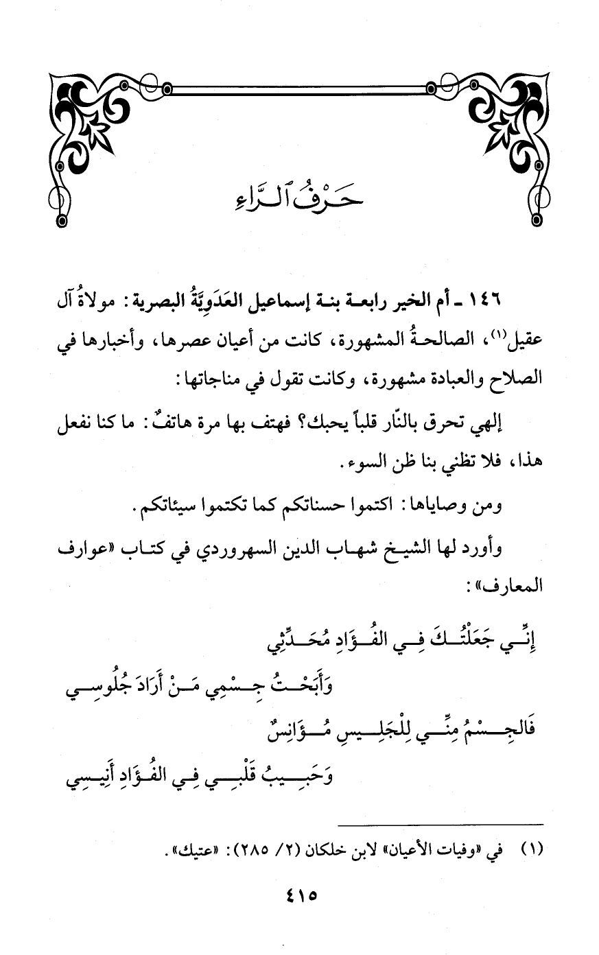 146 - أم الخير رابعة بنة إسماعيل العَدَوِيَّةُ البصرية: مولاةُ آل عقيل (¬1)، الصالحةُ المشهورة، كانت من أعيان عصرها، وأخبارها في الصلاح والعبادة مشهورة، وكانت تقول في مناجاتها: