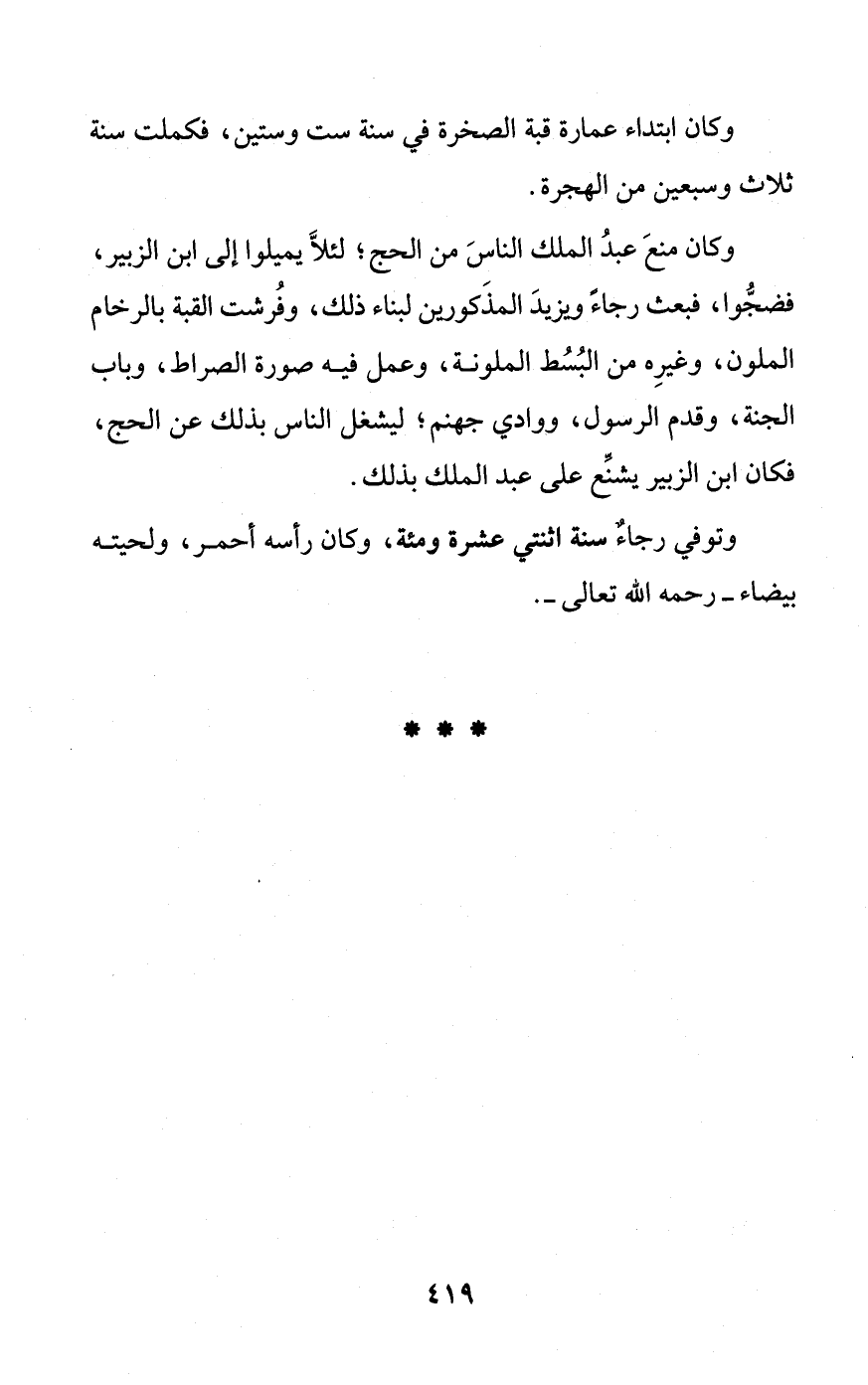 وكان منعَ عبدُ الملك الناسَ من الحج؛ لئلاَّ يميلوا إلى ابن الزبير، فضجُّوا، فبعث رجاءً ويزيدَ المذَكورين لبناء ذلك، وفُرشت القبة بالرخام الملون، وغيرِه من البُسُط الملونة، وعمل فيه صورة الصراط، وباب الجنة، وقدم الرسول، ووادي جهنم؛ ليشغل الناس بذلك عن الحج، فكان ابن الزبير يشنِّع على عبد الملك بذلك.