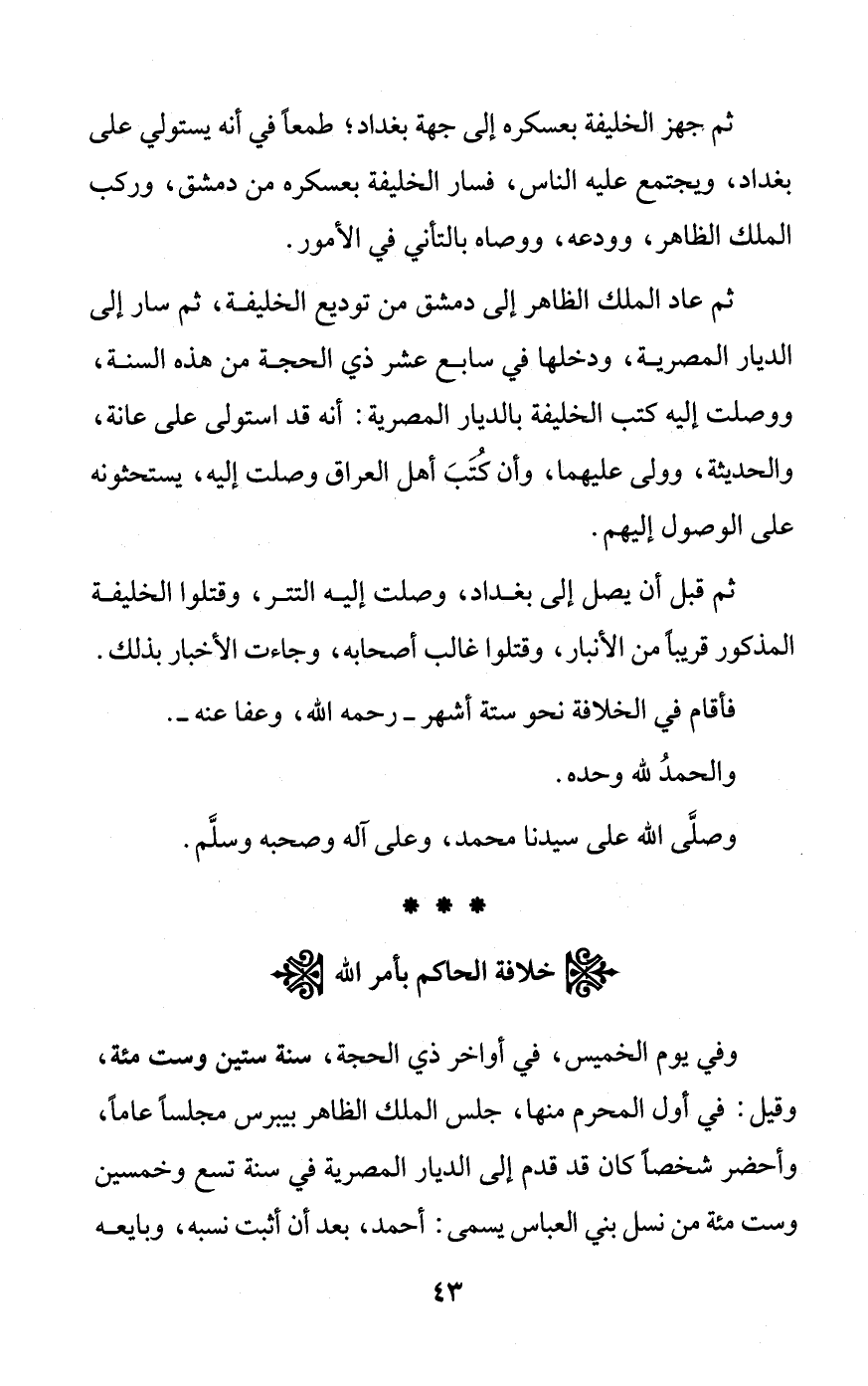 وفي يوم الخميس، في أواخر ذي الحجة، سنة ستين وست مئة، وقيل: في أول المحرم منها، جلس الملك الظاهر بيبرس مجلساً عاماً، وأحضر شخصاً كان قد قدم إلى الديار المصرية في سنة تسع وخمسين وست مئة من نسل بني العباس يسمى: أحمد، بعد أن أثبت نسبه، وبايعه