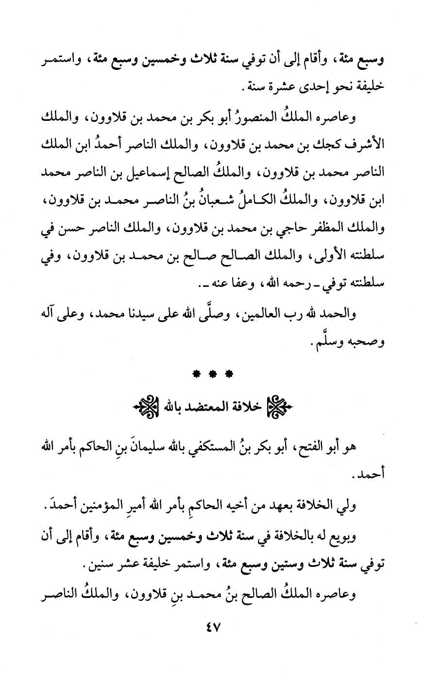 وسبع مئة، وأقام إلى أن توفي سنة ثلاث وخمسين وسبع مئة، واستمر خليفة نحو إحدى عشرة سنة.