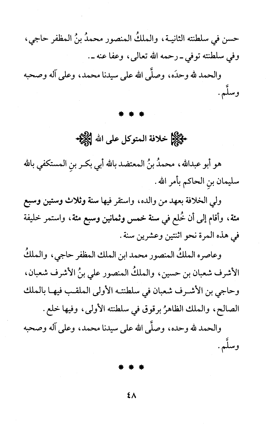 ولي الخلافة بعهد من والده، واستقر فيها سنة وثلاث وستين وسبع مئة، وأقام إلى أن خُلع في سنة خمس وثمانين وسبع مئة، واستمر خليفة في هذه المرة نحو اثنتين وعشرين سنة.