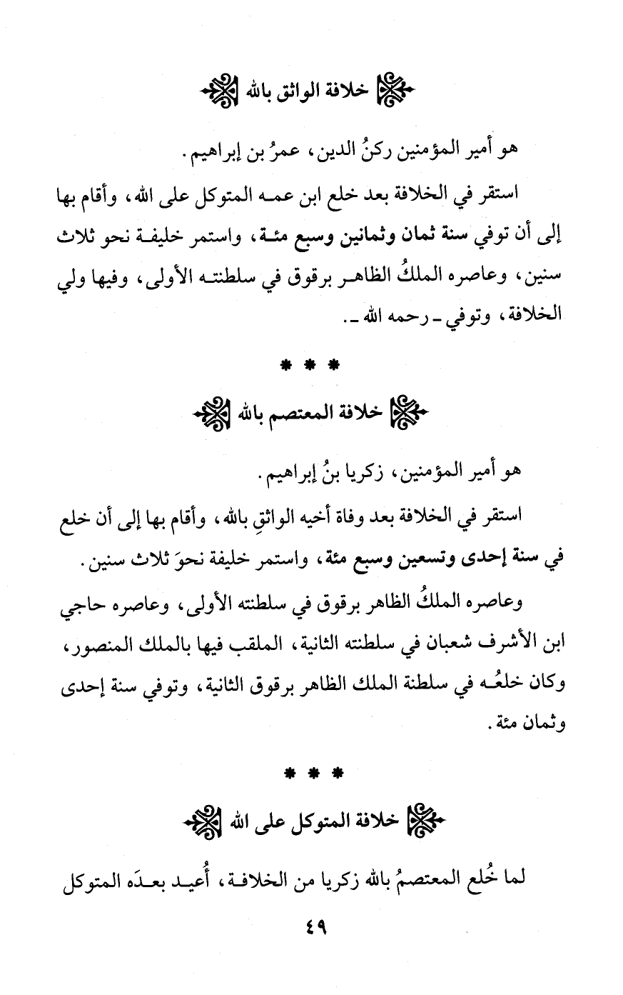 استقر في الخلافة بعد وفاة أخيه الواثقِ بالله، وأقام بها إلى أن خلع في سنة إحدى وتسعين وسبع مئة، واستمر خليفة نحوَ ثلاث سنين.
