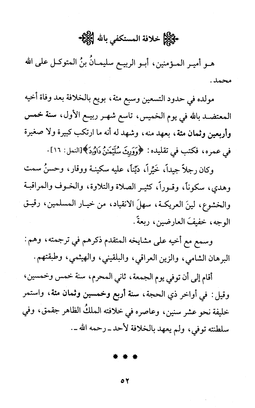 هو أمير المؤمنين، أبو الربيع سليمانُ بنُ المتوكل على الله مولده في حدود التسعين وسبع مئة، بويع بالخلافة بعد وفاة أخيه المعتضد بالله في يوم الخميس، تاسع شهر ربيع الأول، سنة خمس وأربعين وثمان مئه، بعهد منه، وشهد له أنه ما ارتكب كبيرة ولا صغيرة في عمره، فكتب في تقليده: {وَوَرِثَ سُلَيْمَانُ دَاوُودَ} [النمل: 16].