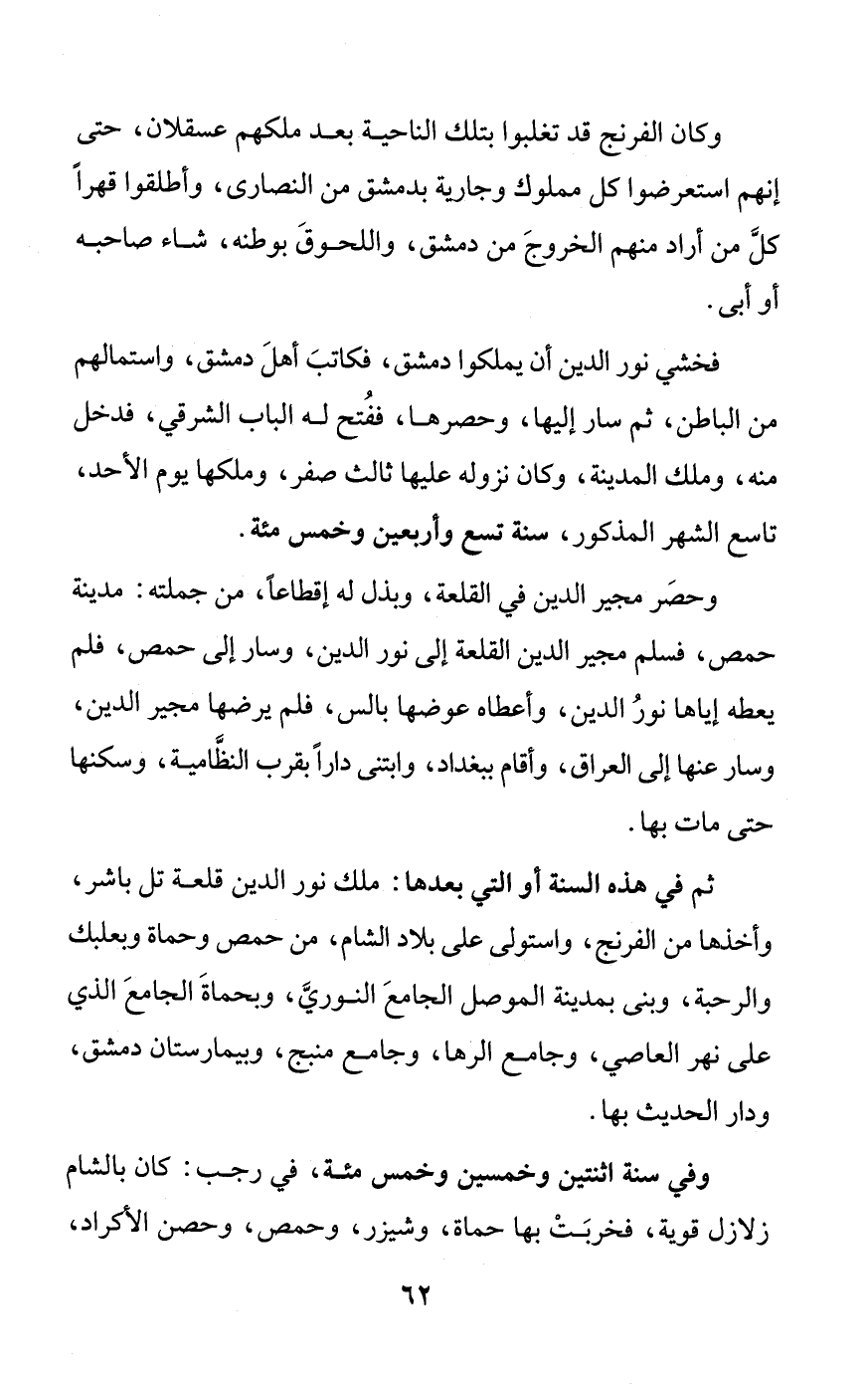 وكان الفرنج قد تغلبوا بتلك الناحية بعد ملكهم عسقلان، حتى إنهم استعرضوا كل مملوك وجارية بدمشق من النصارى، وأطلقوا قهراً كلَّ من أراد منهم الخروجَ من دمشق، واللحوقَ بوطنه، شاء صاحبه أو أبي.