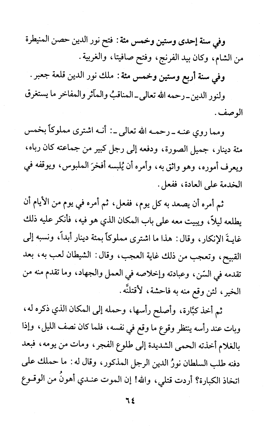 ثم أخذ كبَّارة، وأصلح رأسها، وحمله إلى المكان الذي ذكره له، وبات عند رأسه ينتظر وقوع ما وقع في نفسه، فلما كان نصف الليل، وإذا بالغلام أخذته الحمى الشديدة إلى طلوع الفجر، ومات من يومه، فبعد دفنه طلب السلطان نورُ الدين الرجل المذكور، وقال له: ما حملك على اتخاذ الكبارة؟ أردت قتلي، والله! إن الموت عندي أهونُ من الوقوع