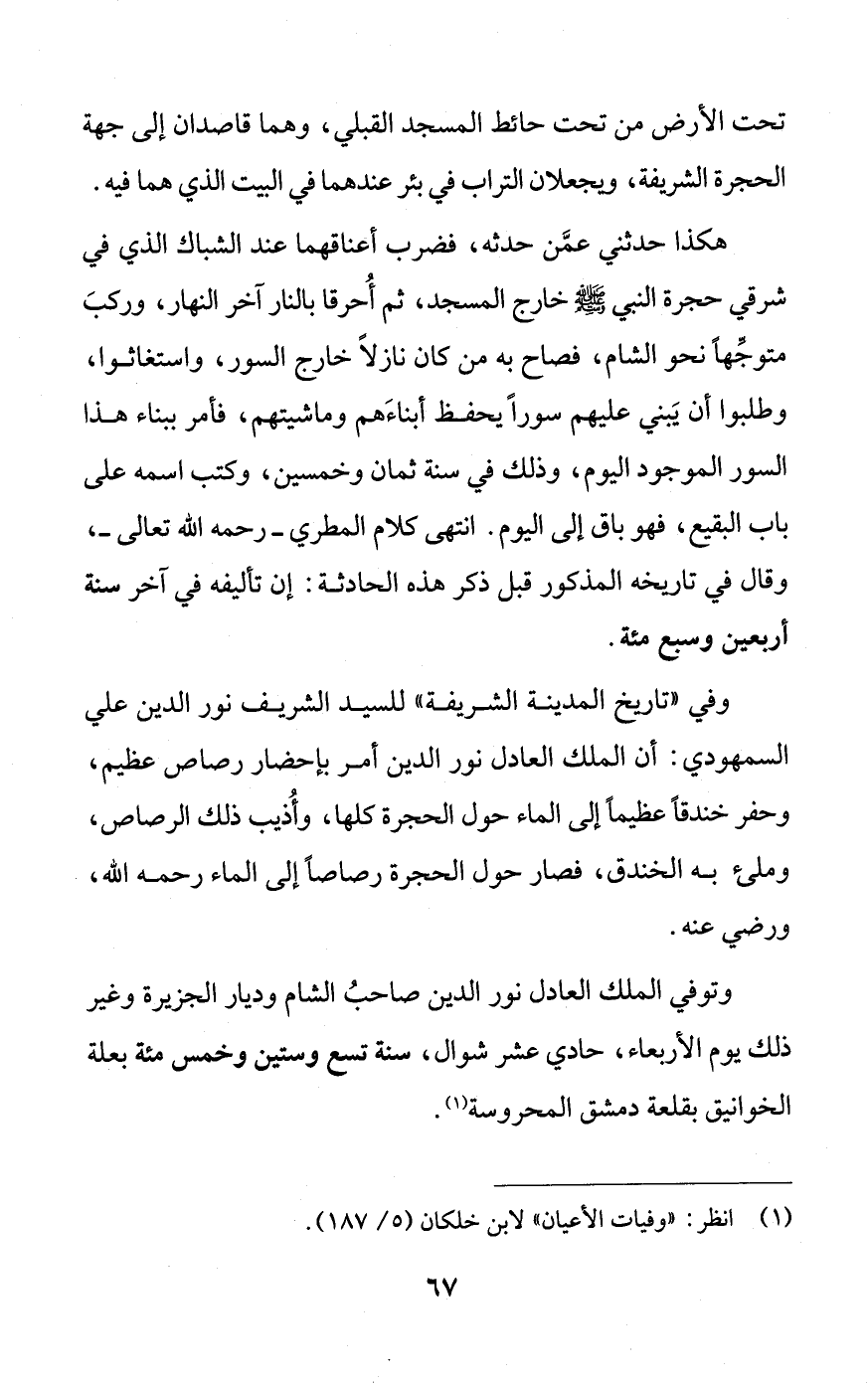 هكذا حدثني عمَّن حدثه، فضرب أعناقهما عند الشباك الذي في شرقي حجرة النبي - صلى الله عليه وسلم - خارج المسجد، ثم أُحرقا بالنار آخر النهار، وركبَ متوجِّهاً نحو الشام، فصاح به من كان نازلاً خارج السور، واستغاثوا، وطلبوا أن يَبني عليهم سوراً يحفظ أبناءَهم وماشيتهم، فأمر ببناء هذا السور الموجود اليوم، وذلك في سنة ثمان وخمسين، وكتب اسمه على باب البقيع، فهو باق إلى اليوم. انتهى كلام المطري - رحمه الله تعالى -، وقال في تاريخه المذكور قبل ذكر هذه الحادثة: إن تأليفه في آخر سنة أربعين وسبع مئة.