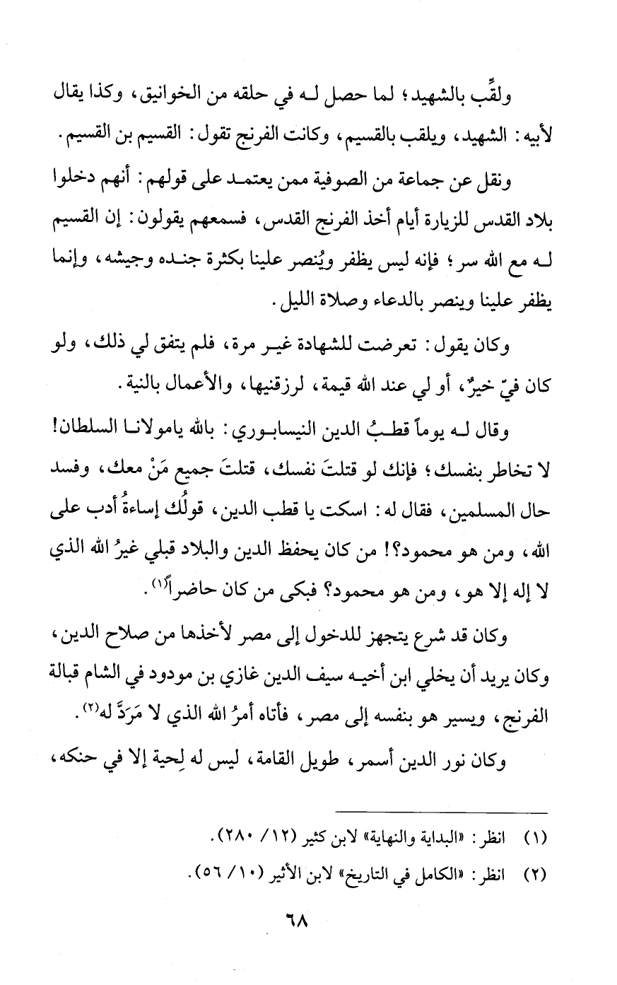 ونقل عن جماعة من الصوفية ممن يعتمد على قولهم: أنهم دخلوا بلاد القدس للزيارة أيام أخذ الفرنج القدس، فسمعهم يقولون: إن القسيم له مع الله سر؛ فإنه ليس يظفر ويُنصر علينا بكثرة جنده وجيشه، وإنما يظفر علينا وينصر بالدعاء وصلاة الليل.