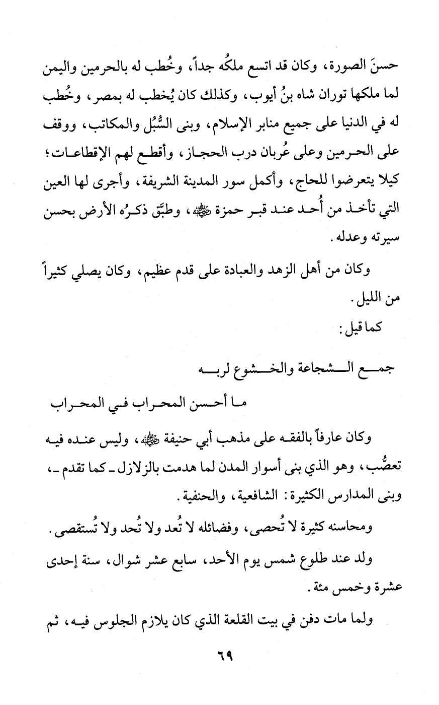 حسنَ الصورة، وكان قد اتسع ملكُه جداً، وخُطب له بالحرمين واليمن لما ملكها توران شاه بنُ أيوب، وكذلك كان يُخطب له بمصر، وخُطب له في الدنيا على جميع منابر الإسلام، وبنى السُّبُل والمكاتب، ووقف على الحرمين وعلى عُربان درب الحجاز، وأقطع لهم الإقطاعات؛ كيلا يتعرضوا للحاج، وأكمل سور المدينة الشريفة، وأجرى لها العين التي تأخذ من أُحد عند قبر حمزة - رضي الله عنه -، وطبَّق ذكرُه الأرض بحسن سيرته وعدله.