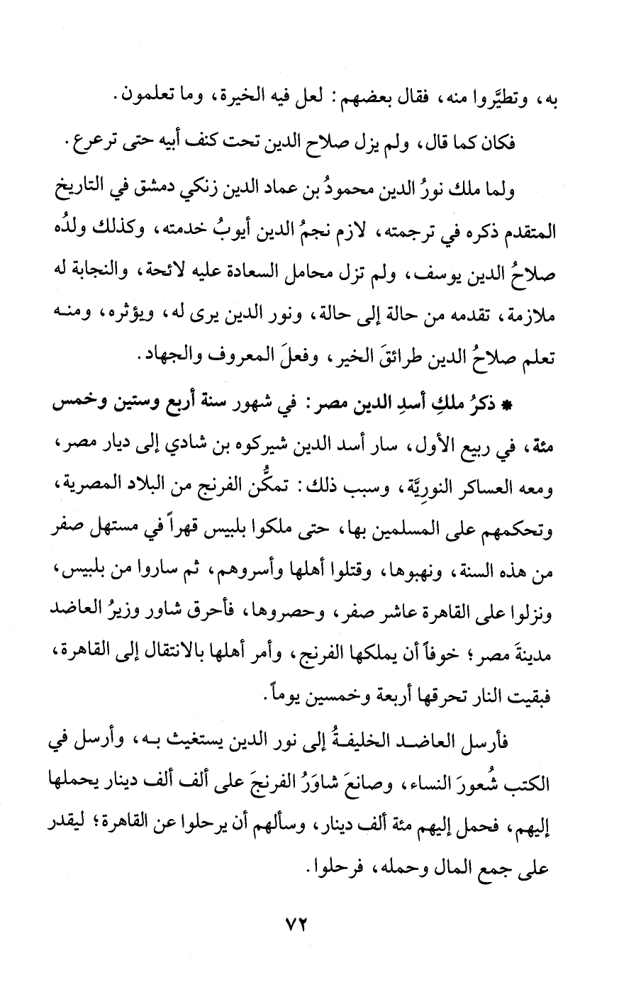* ذكرُ ملكِ أسدِ الدين مصر: في شهور سنة أربع وستين وخمس مئة، في ربيع الأول، سار أسد الدين شيركوه بن شادي إلى ديار مصر، ومعه العساكر النورِيَّة، وسبب ذلك: تمكُّن الفرنج من البلاد المصرية، وتحكمهم على المسلمين بها، حتى ملكوا بلبيس قهراً في مستهل صفر من هذه السنة، ونهبوها، وقتلوا أهلها وأسروهم، ثم ساروا من بلبيس، ونزلوا على القاهرة عاشر صفر، وحصروها، فأحرق شاور وزيرُ العاضد مدينةَ مصر، خوفاً أن يملكها الفرنج، وأمر أهلها بالانتقال إلى القاهرة، فبقيت النار تحرقها أربعة وخمسين يوماً.