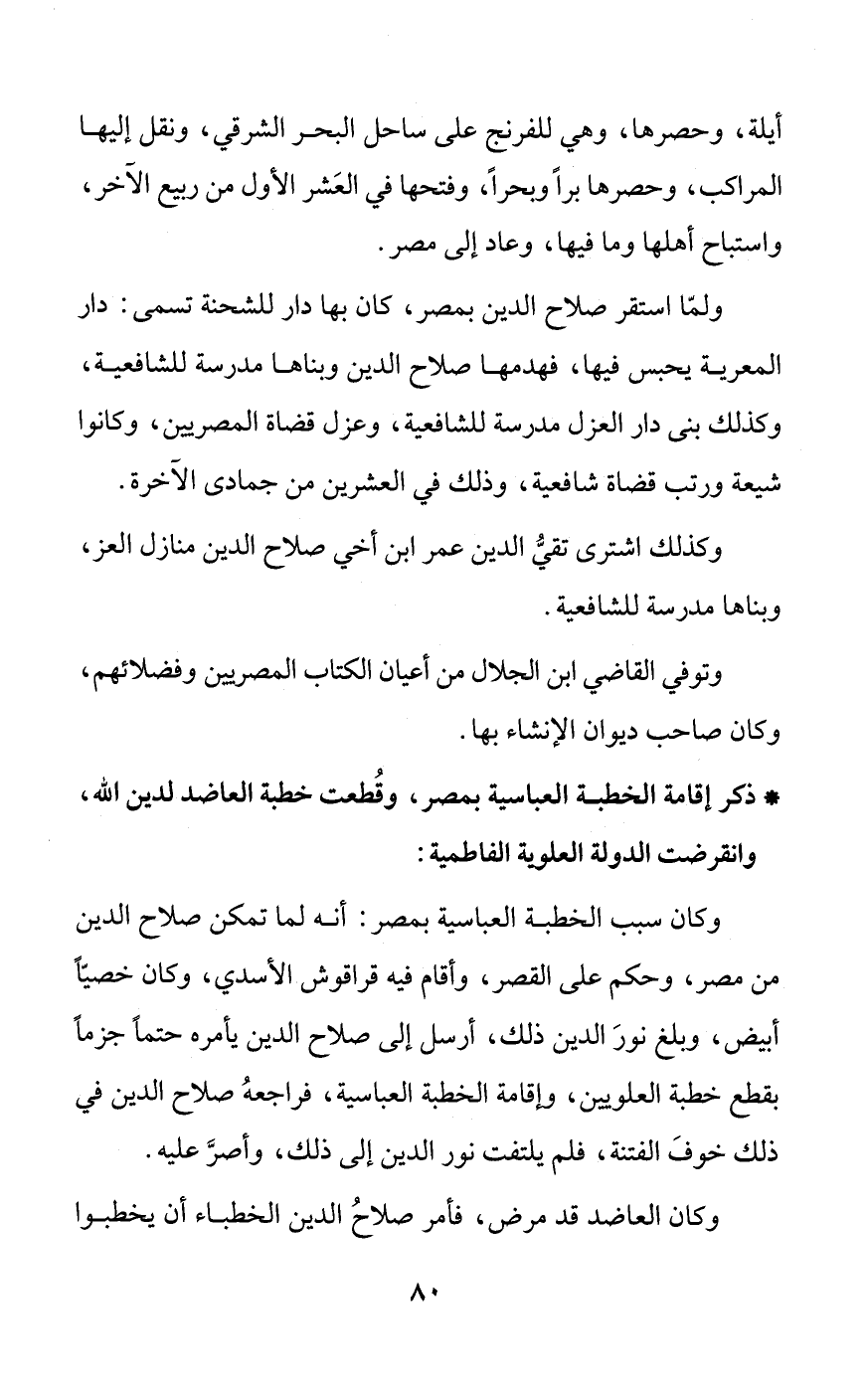 * ذكر إقامة الخطبة العباسية بمصر، وقُطعت خطبة العاضد لدين الله، وانقرضت الدولة العلوية الفاطمية: