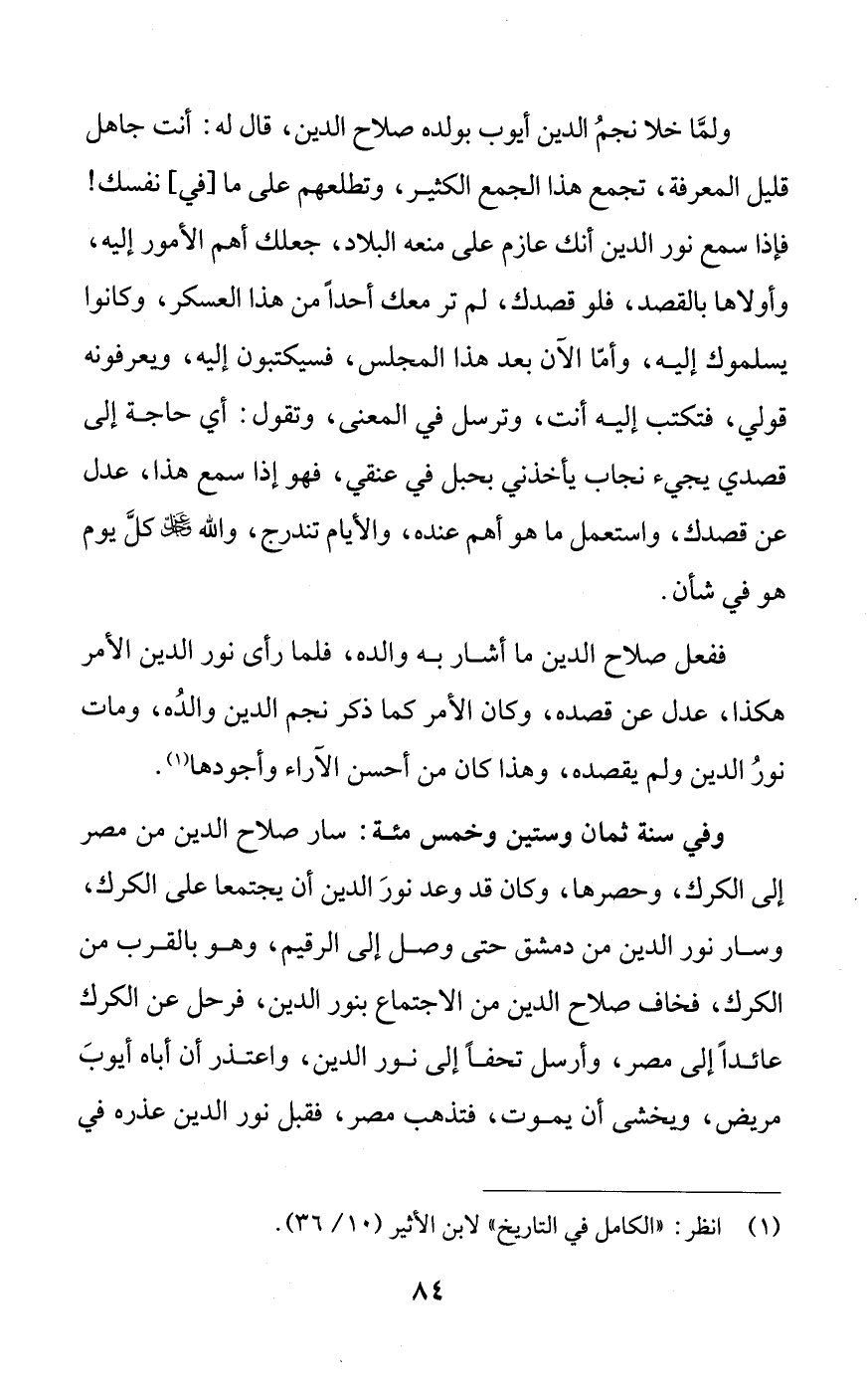 ولمَّا خلا نجمُ الدين أيوب بولده صلاح الدين، قال له: أنت جاهل قليل المعرفة، تجمع هذا الجمع الكثير، وتطلعهم على ما [في] نفسك! فإذا سمع نور الدين أنك عازم على منعه البلاد، جعلك أهم الأمور إليه، وأولاها بالقصد، فلو قصدك، لم تر معك أحداً من هذا العسكر، وكانوا يسلموك إليه، وأمّا الآن بعد هذا المجلس، فسيكتبون إليه، ويعرفونه قولي، فتكتب إليه أنت، وترسل في المعنى، وتقول: أي حاجة إلى قصدي يجيء نجاب يأخذني بحبل في عنقي، فهو إذا سمع هذا، عدل عن قصدك، واستعمل ما هو أهم عنده، والأيام تندرج، والله - عَزَّ وَجَلَّ - كلَّ يوم هو في شأن.