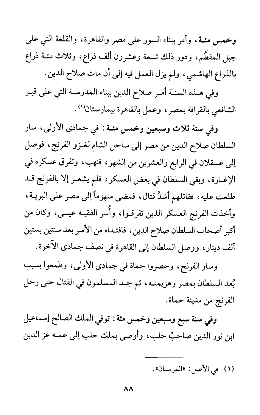 وخمس مئة، وأمر ببناء السور على مصر والقاهرة، والقلعة التي على جبل المقطَّم، ودور ذلك تسعة وعشرون ألف ذراع، وثلاث مئة ذراع بالذراع الهاشمي، ولم يزل العمل فيه إلى أن مات صلاح الدين.