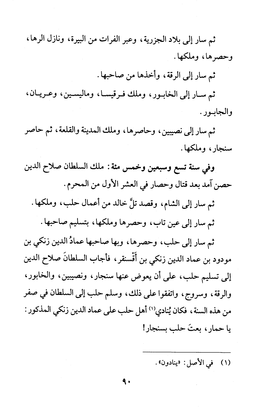 ثم سار إلى حلب، وحصرها، وبها صاحبها عمادُ الدين زنكي بن مودود بن عماد الدين زنكي بن أَقْسنقر، فأجاب السلطانَ صلاح الدين إلى تسليم حلب، على أن يعوض عنها سنجار، ونصيبين، والخابور، والرقة، وسروج، واتفقوا على ذلك، وسلم حلب إلى السلطان في صفر من هذه السنة، فكان يُنادي (¬1) أهل حلب على عماد الدين زنكي المذكور: يا حمار، بعتَ حلب بسنجار!