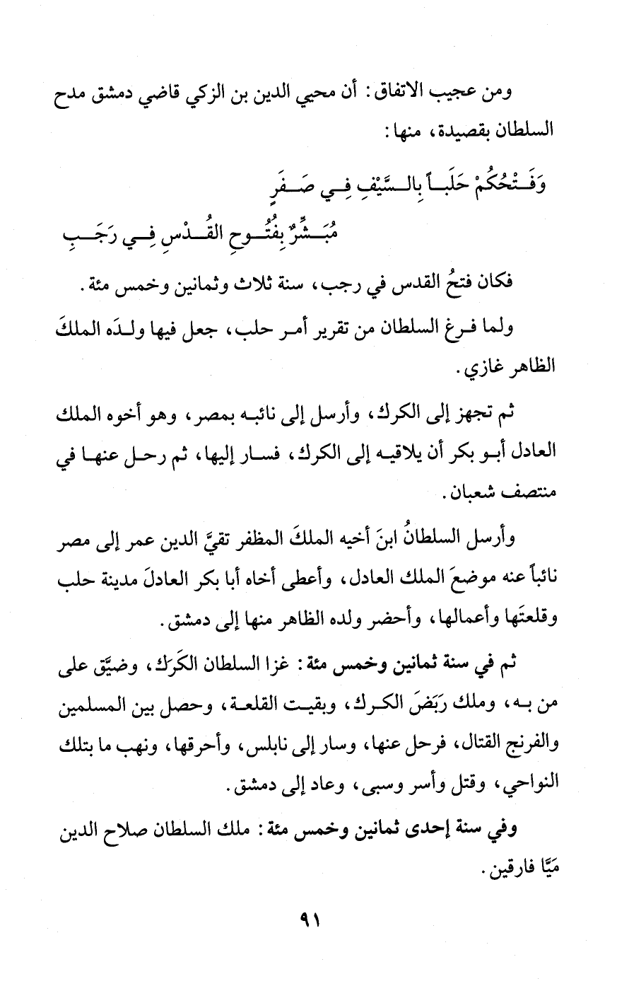 وَفَتْحُكُمْ حَلَباً بِالسَّيْفِ فِي صفَرٍ ... مُبَشّرٌ بِفُتُوحِ القُدْسِ فِي رَجَبِ