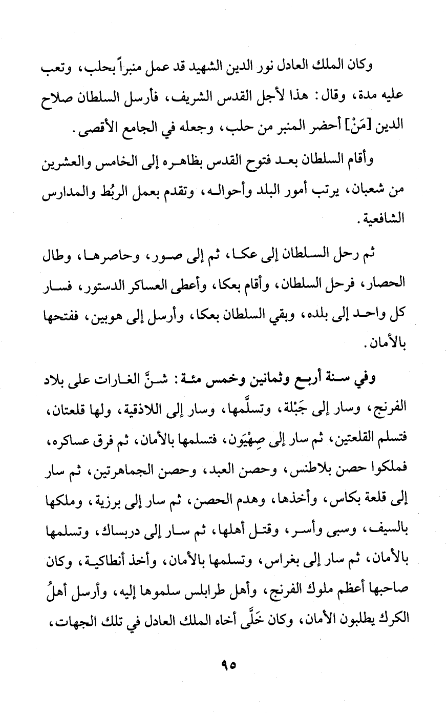 وأقام السلطان بعد فتوح القدس بظاهره إلى الخامس والعشرين من شعبان، يرتب أمور البلد وأحواله، وتقدم بعمل الربُط والمدارس الشافعية.