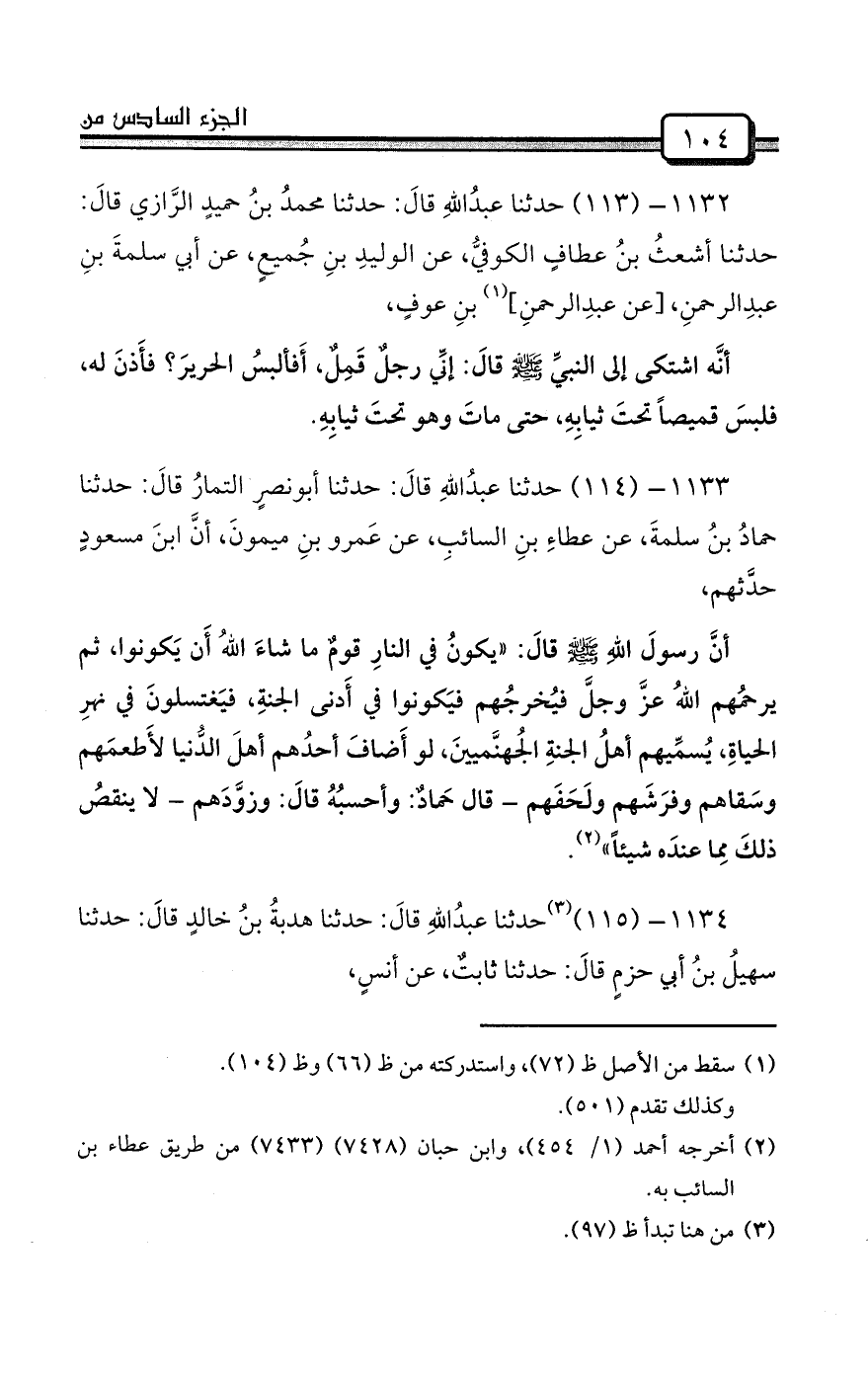 1134- (115) (¬3) حدثنا عبدُاللهِ قالَ: حدثنا هدبةُ بنُ خالدٍ قالَ: حدثنا سهيلُ بنُ أبي حزمٍ قالَ: حدثنا ثابتٌ، عن أنسٍ،