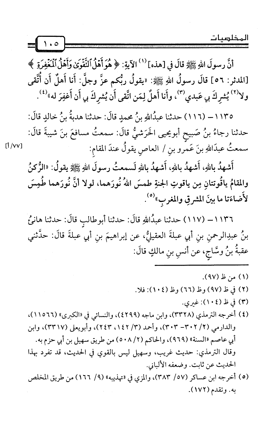 1135- (116) حدثنا عبدُاللهِ بنُ محمدٍ قالَ: حدثنا هدبةُ بنُ خالدٍ قالَ: حدثنا رجاءُ بنُ صَبيحٍ أبويحيى الَحرَشيُّ قالَ: سمعتُ مسافعَ بنَ شيبةَ قالَ: سمعتُ عبدَاللهِ بنَ عَمرو بنِ / العاصِ يقولُ عندَ المقامِ: