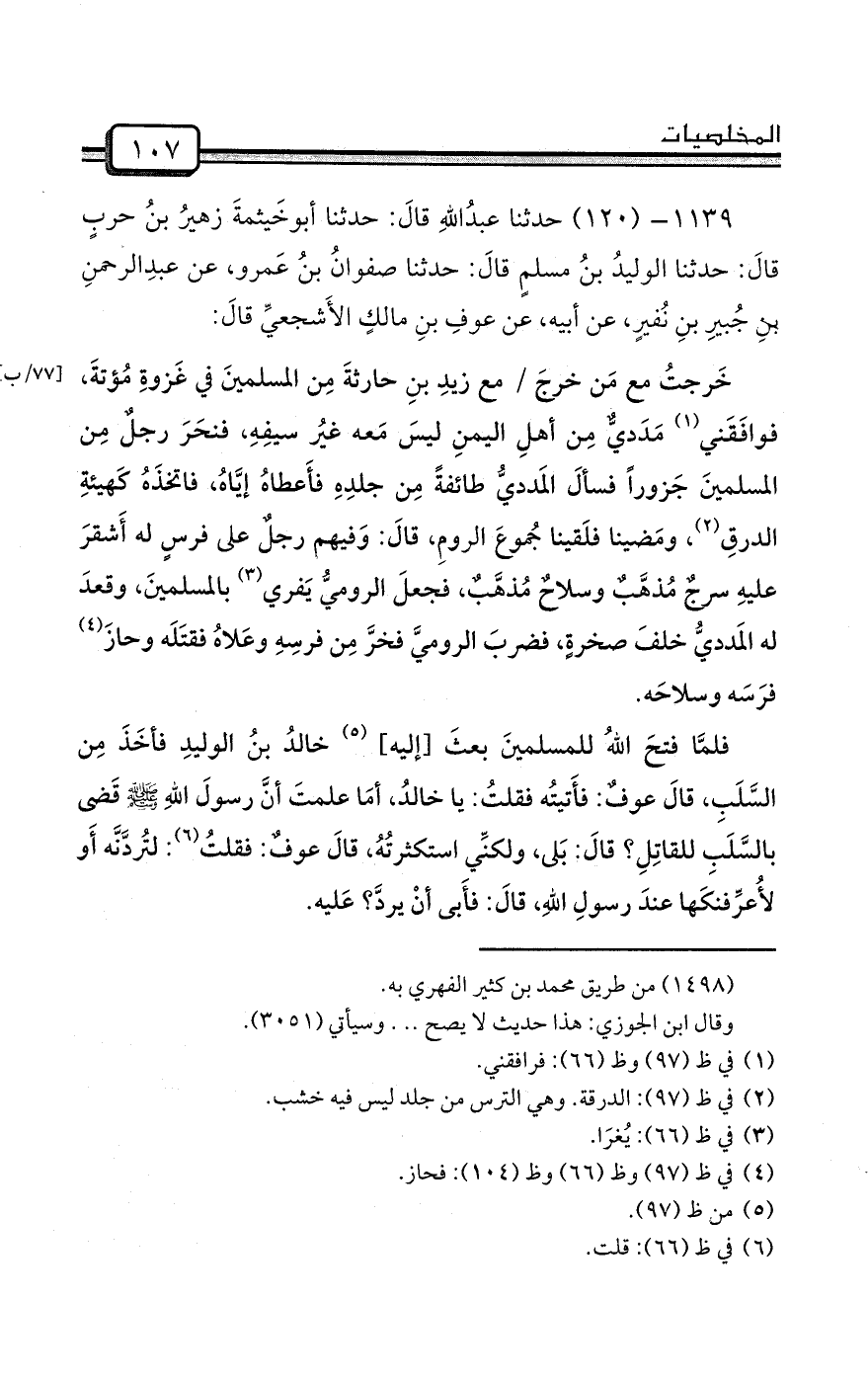 1139- (120) حدثنا عبدُاللهِ قالَ: حدثنا أبوخَيثمةَ زهيرُ بنُ حربٍ قالَ: حدثنا الوليدُ بنُ مسلمٍ قالَ: حدثنا صفوانُ بنُ عَمرو، عن عبدِالرحمنِ بنِ جُبيرِ بنِ نُفيرٍ، عن أبيه، عن عوفِ بنِ مالكٍ الأَشجعيِّ قالَ:
