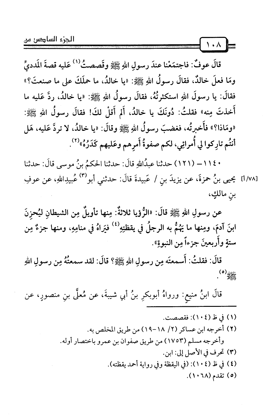 1140- (121) حدثنا عبدُاللهِ قالَ: حدثنا الحكمُ بنُ موسى قالَ: حدثنا يحيى بنُ حمزةَ، عن يزيدَ بنِ / عَبيدةَ قالَ: حدثني أبو (¬3) عُبيدِاللهِ، عن عوفِ بنِ مالكٍ،