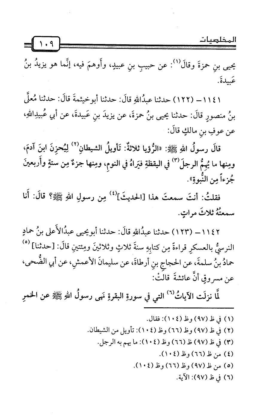 1142- (123) حدثنا عبدُاللهِ قالَ: حدثنا أبويحيى عبدُالأَعلى بنُ حمادٍ النرسيُّ بالعسكرِ قراءةً مِن كتابِهِ سنةَ ثلاثٍ وثلاثينَ ومِئتينِ قالَ: [حدثنا] (¬5) حمادُ بنُ سلمةَ، عن الحجاجِ بنِ أرطاةَ، عن سليمانَ الأعمشِ، عن أبي الضُّحى، عن مسروقٍ أنَّ عائشةَ قالتْ: