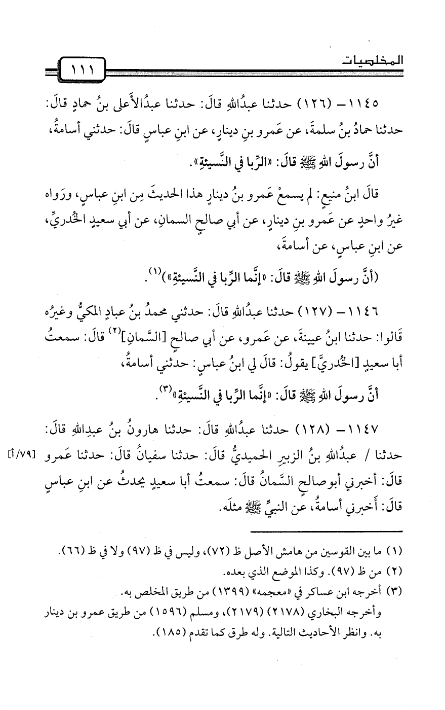 1145- (126) حدثنا عبدُاللهِ قالَ: حدثنا عبدُالأَعلى بنُ حمادٍ قالَ: حدثنا حمادُ بنُ سلمةَ، عن عَمرو بنِ دينارٍ، عن ابنِ عباسٍ قالَ: حدثني أسامةُ،