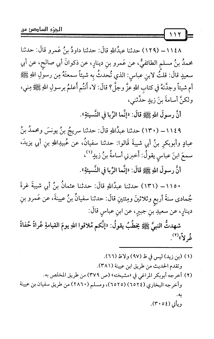1149- (130) حدثنا عبدُاللهِ قالَ: حدثنا سريجُ بنُ يونسَ ومحمدُ بنُ عبادٍ وأبوبكرِ بنُ أبي شيبةَ قَالوا: حدثنا سفيانُ، عن عُبيدِاللهِ بنِ أبي يزيدَ، سمعَ ابنَ عباسٍ يقولُ: أَخبرني أسامةُ بنُ زيدٍ (¬1) ،