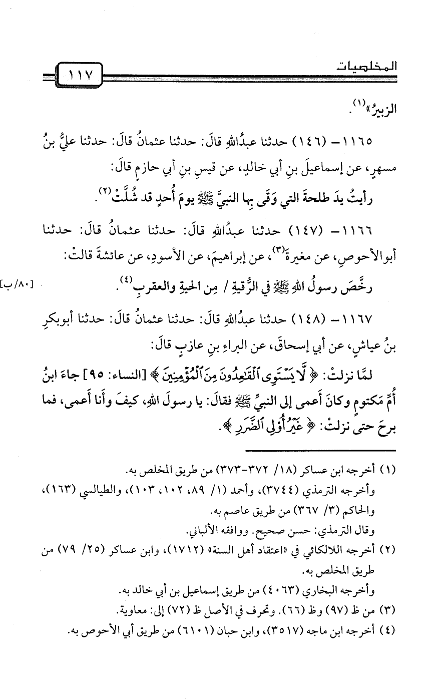 1167- (148) حدثنا عبدُاللهِ قالَ: حدثنا عثمانُ قالَ: حدثنا أبوبكرِ بنُ عياشٍ، عن أبي إسحاقَ، عن البراءِ بنِ عازبٍ قالَ: