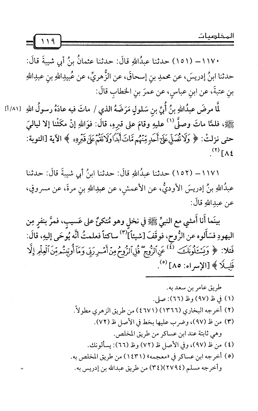1170- (151) حدثنا عبدُاللهِ قالَ: حدثنا عثمانُ بنُ أبي شيبةَ قالَ: حدثنا ابنُ إدريسَ، عن محمدِ بنِ إسحاقَ، عن الزُّهريِّ، عن عُبيدِاللهِ بنِ عبدِاللهِ بنِ عتبةَ، عن ابنِ عباسٍ، عن عمرَ بنِ الخطابِ قالَ: