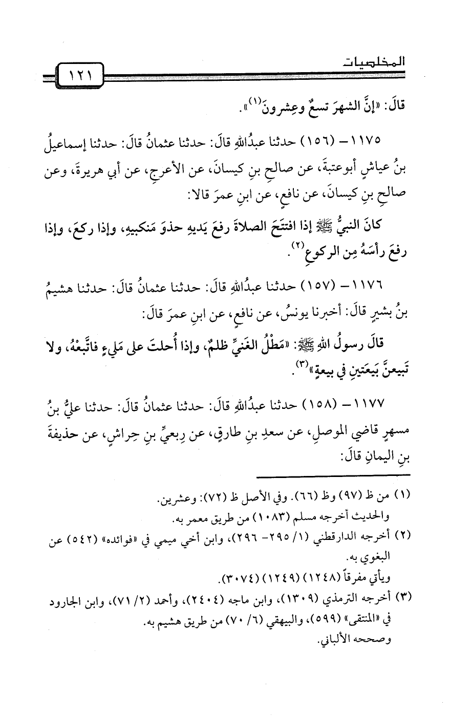 1176- (157) حدثنا عبدُاللهِ قالَ: حدثنا عثمانُ قالَ: حدثنا هشيمُ بنُ بشيرٍ قالَ: أخبرنا يونسُ، عن نافعٍ، عن ابنِ عمرَ قالَ: