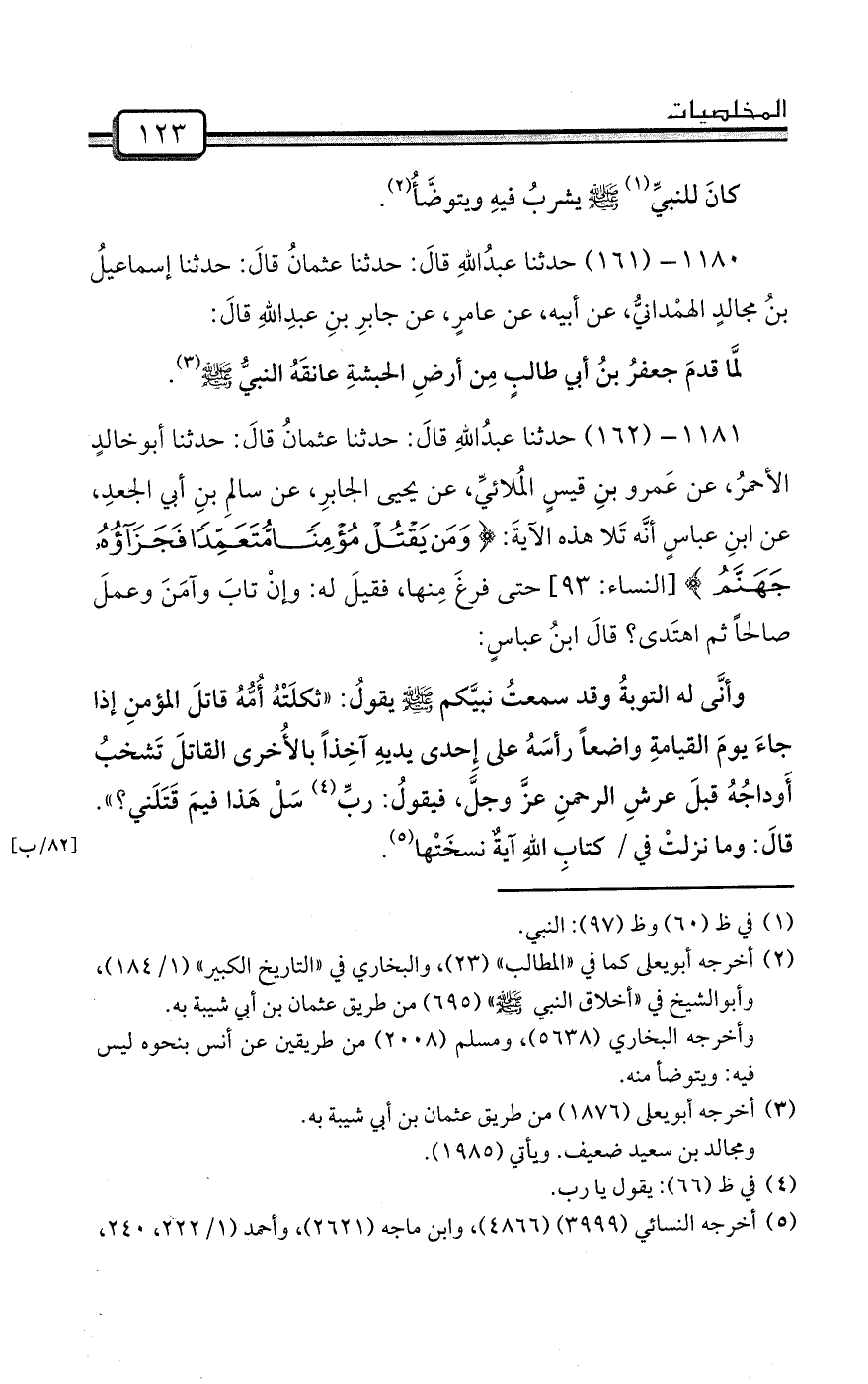 1180- (161) حدثنا عبدُاللهِ قالَ: حدثنا عثمانُ قالَ: حدثنا إسماعيلُ بنُ مجالدٍ الهمْدانيُّ، عن أبيه، عن عامرٍ، عن جابرِ بنِ عبدِاللهِ قالَ:
