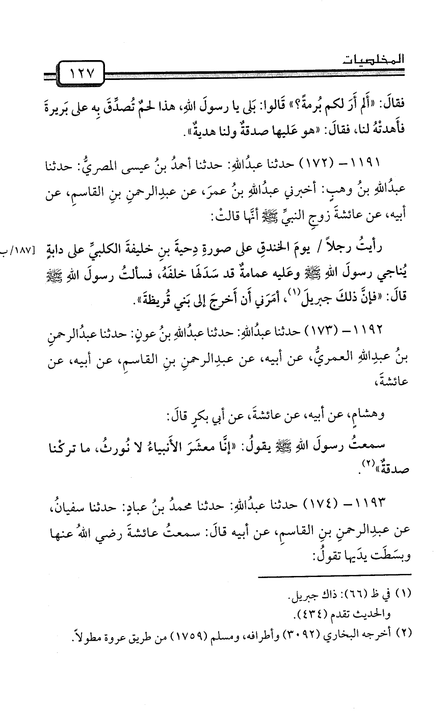 1191- (172) حدثنا عبدُاللهِ: حدثنا أحمدُ بنُ عيسى المصريُّ: حدثنا عبدُاللهِ بنُ وهبٍ: أخبرني عبدُاللهِ بنُ عمرَ، عن عبدِالرحمنِ بنِ القاسمِ، عن أبيه، عن عائشةَ زوجِ النبيِّ صلى الله عليه وسلم أنَّها قالتْ: