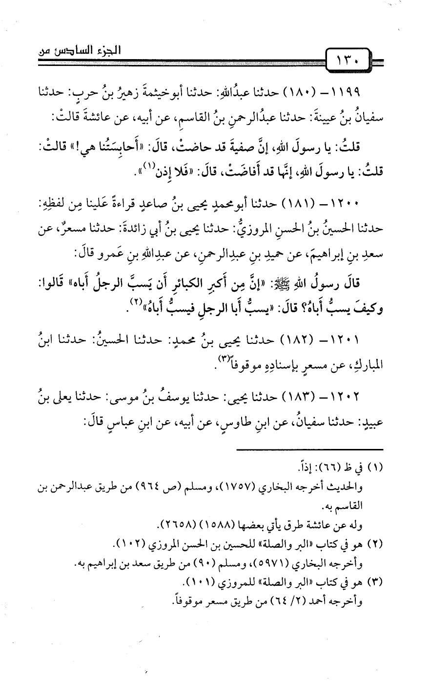1199- (180) حدثنا عبدُاللهِ: حدثنا أبوخيثمةَ زهيرُ بنُ حربٍ: حدثنا سفيانُ بنُ عيينةَ: حدثنا عبدُالرحمنِ بنُ القاسمِ، عن أبيه، عن عائشةَ قالتْ: