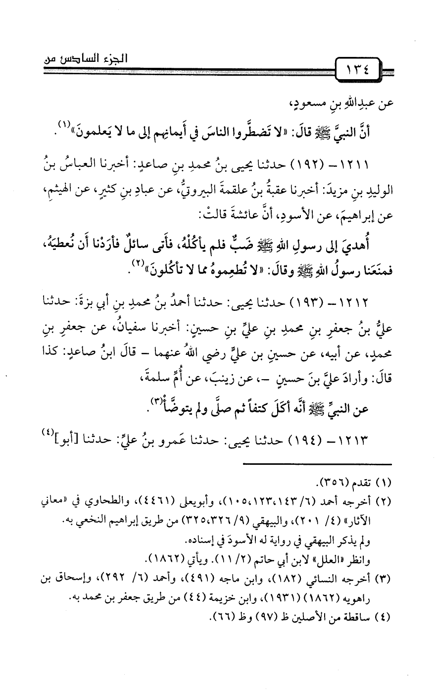 1212- (193) حدثنا يحيى: حدثنا أحمدُ بنُ محمدِ بنِ أبي بزةَ: حدثنا عليُّ بنُ جعفرِ بنِ محمدِ بنِ عليِّ بنِ حسينٍ: أخبرنا سفيانُ، عن جعفرِ بنِ محمدٍ، عن أبيه، عن حسينِ بن عليٍّ رضي اللهُ عنهما - قالَ ابنُ صاعدٍ: كذا قالَ: وأرادَ عليَّ بنَ حسينٍ -، عن زينبَ، عن أُمِّ سلمةَ،