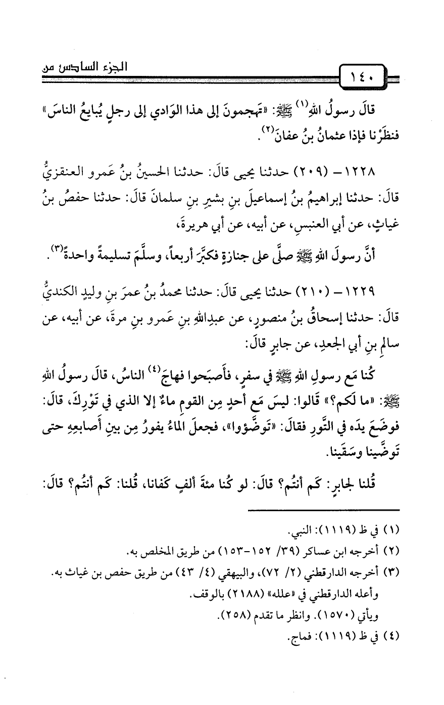 1229- (210) حدثنا يحيى قالَ: حدثنا محمدُ بنُ عمرَ بنِ وليدٍ الكنديُّ قالَ: حدثنا إسحاقُ بنُ منصورٍ، عن عبدِاللهِ بنِ عَمرو بنِ مرةَ، عن أبيه، عن سالمِ بنِ أبي الجعدِ، عن جابرٍ قالَ: