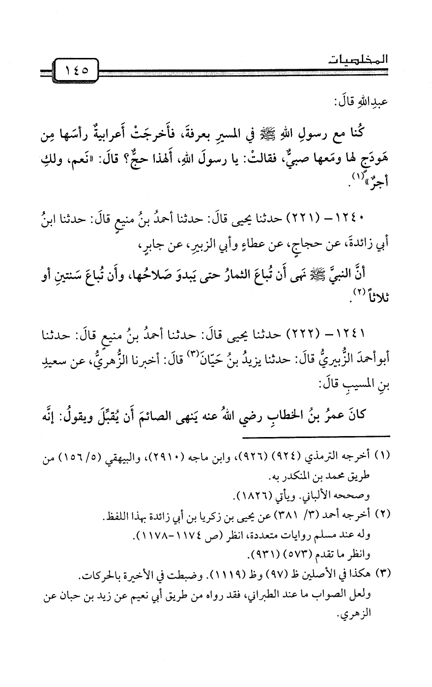 1240- (221) حدثنا يحيى قالَ: حدثنا أحمدُ بنُ منيعٍ قالَ: حدثنا ابنُ أبي زائدةَ، عن حجاجٍ، عن عطاءٍ وأبي الزبيرِ، عن جابرٍ،