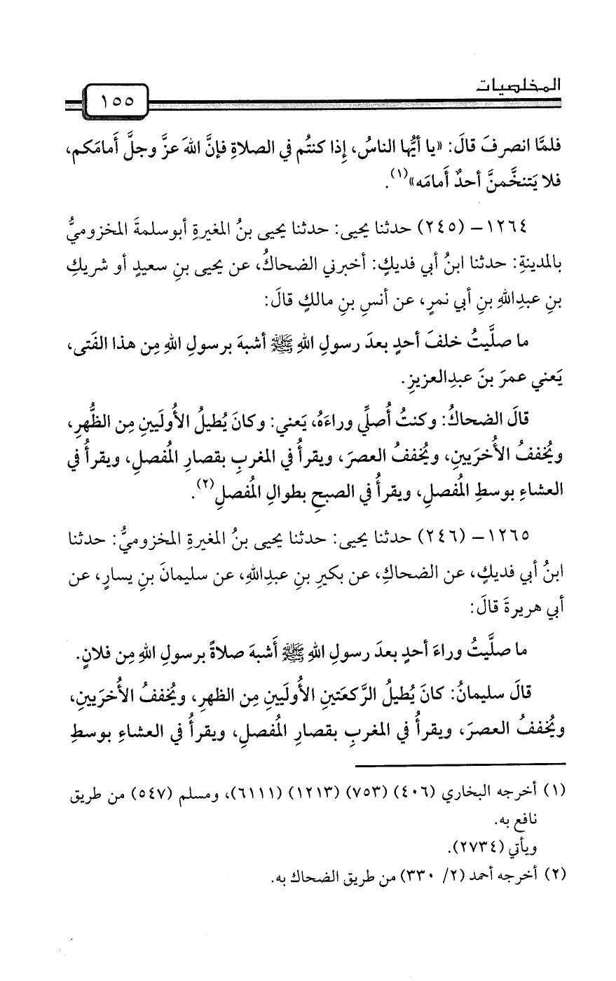 1264- (245) حدثنا يحيى: حدثنا يحيى بنُ المغيرةِ أبوسلمةَ المخزوميُّ بالمدينةِ: حدثنا ابنُ أبي فديكٍ: أخبرني الضحاكُ، عن يحيى بنِ سعيدٍ أو شريكِ بنِ عبدِاللهِ بنِ أبي نمرٍ، عن أنسِ بنِ مالكٍ قالَ: