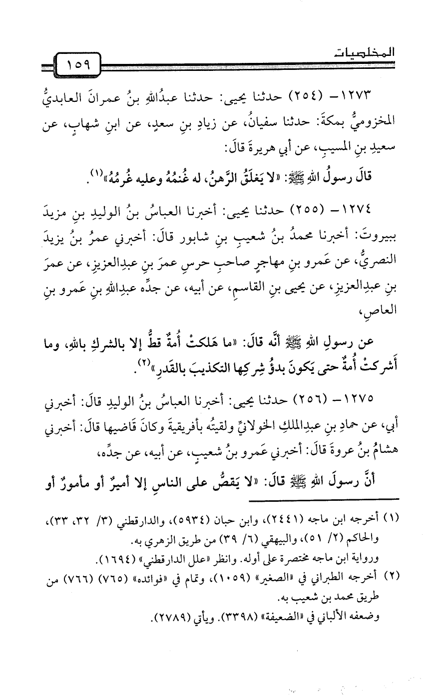 1275- (256) حدثنا يحيى: أخبرنا العباسُ بنُ الوليدِ قالَ: أخبرني أبي، عن حمادِ بنِ عبدِالملكِ الخولانيِّ ولقيتُه بأفريقيةَ وكانَ قَاضيها قالَ: أخبرني هشامُ بنُ عروةَ قالَ: أخبرني عَمرو بنُ شعيبٍ، عن أبيه، عن جدِّه،