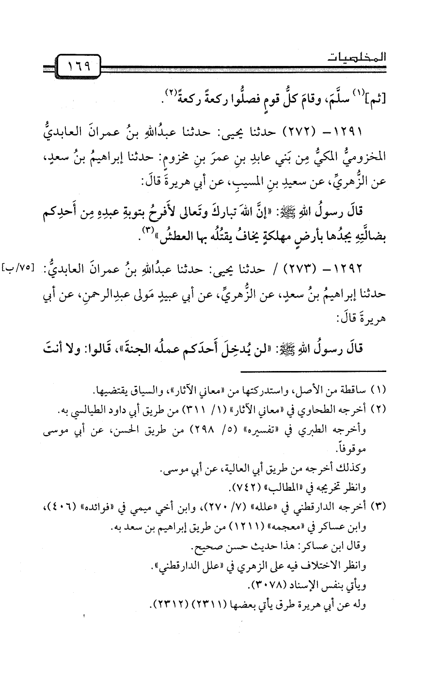 1291- (272) حدثنا يحيى: حدثنا عبدُاللهِ بنُ عمرانَ العابديُّ المخزوميُّ المكيُّ مِن بَني عابدِ بنِ عمرَ بنِ مخزومٍ: حدثنا إبراهيمُ بنُ سعدٍ، عن الزُّهريِّ، عن سعيدِ بنِ المسيبِ، عن أبي هريرةَ قالَ: