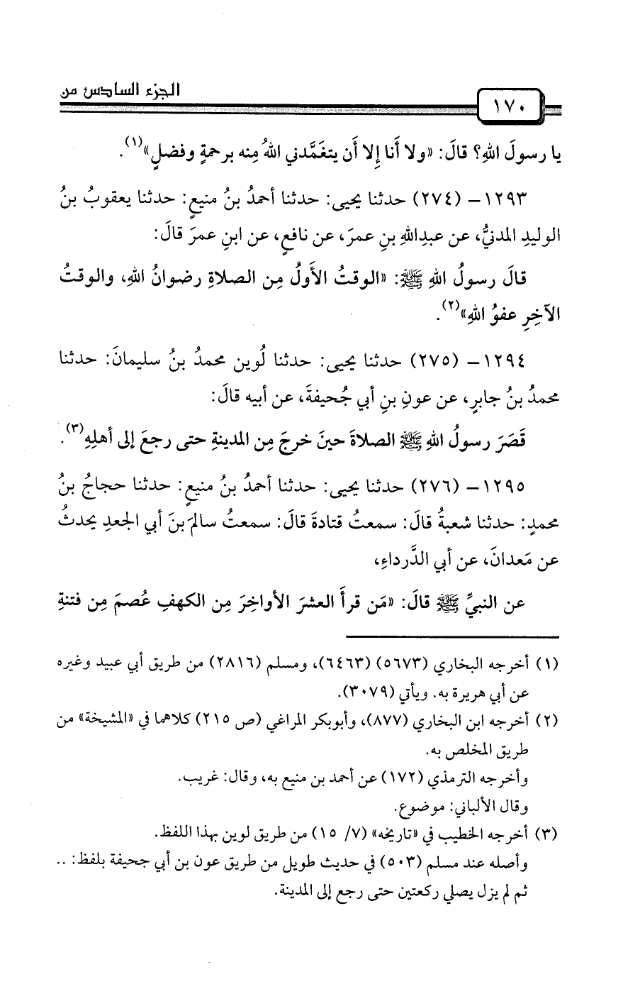 1295- (276) حدثنا يحيى: حدثنا أحمدُ بنُ منيعٍ: حدثنا حجاجُ بنُ محمدٍ: حدثنا شعبةُ قالَ: سمعتُ قتادةَ قالَ: سمعتُ سالمَ بنَ أبي الجعدِ يحدثُ عن مَعدانَ، عن أبي الدَّرداءِ،