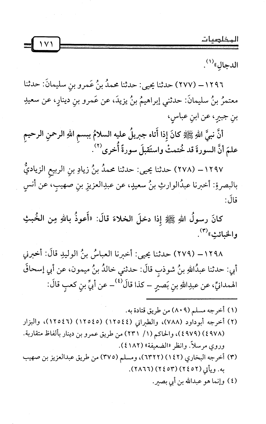 1297- (278) حدثنا يحيى: حدثنا محمدُ بنُ زيادِ بنِ الربيعِ الزياديُّ بالبصرةِ: أخبرنا عبدُالوارثِ بنُ سعيدٍ، عن عبدِالعزيزِ بنِ صهيبٍ، عن أنسٍ قالَ: