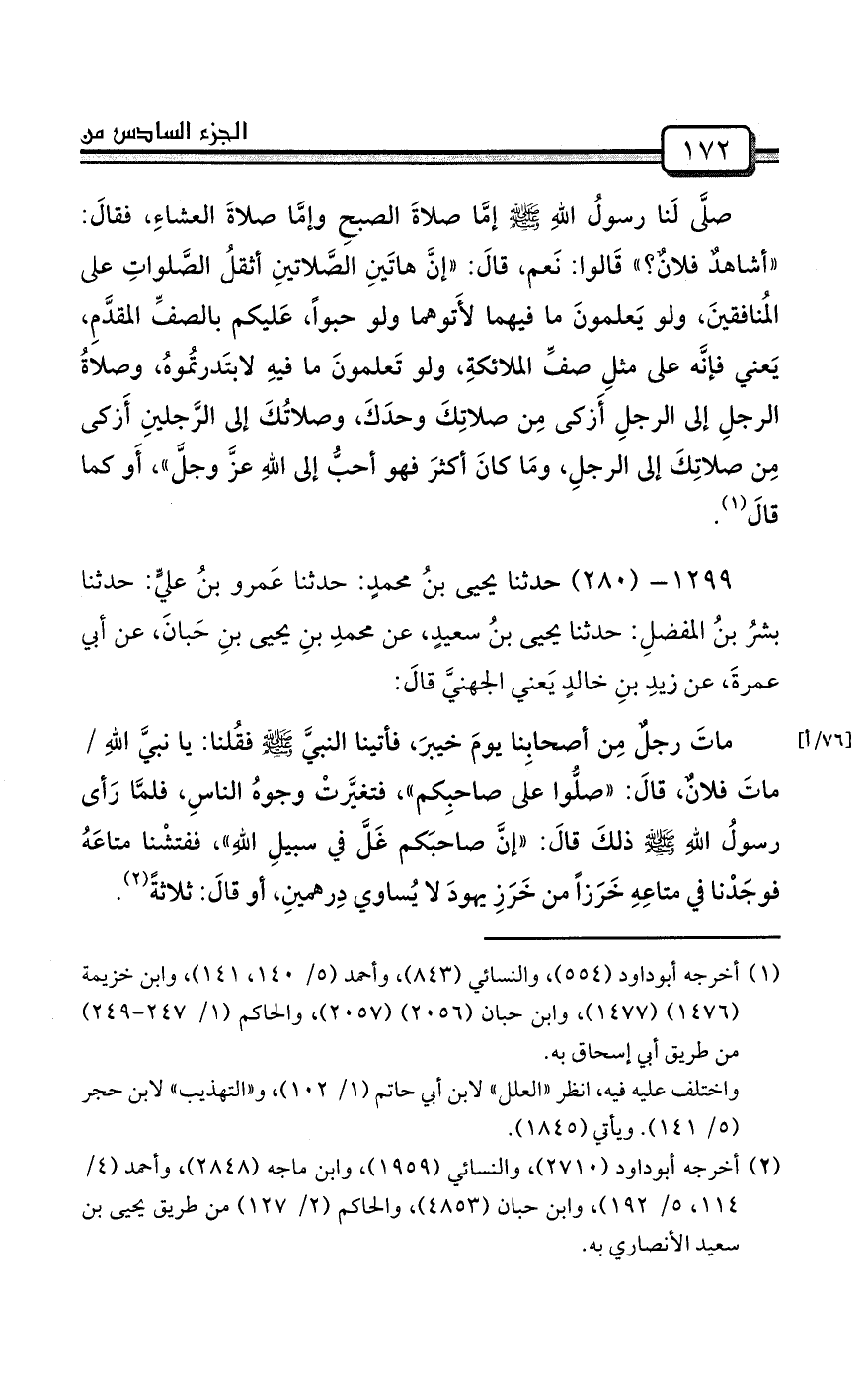 1299- (280) حدثنا يحيى بنُ محمدٍ: حدثنا عَمرو بنُ عليٍّ: حدثنا بشرُ بنُ المفضلِ: حدثنا يحيى بنُ سعيدٍ، عن محمدِ بنِ يحيى بنِ حَبانَ، عن أبي عمرةَ، عن زيدِ بنِ خالدٍ يَعني الجهنيَّ قالَ: