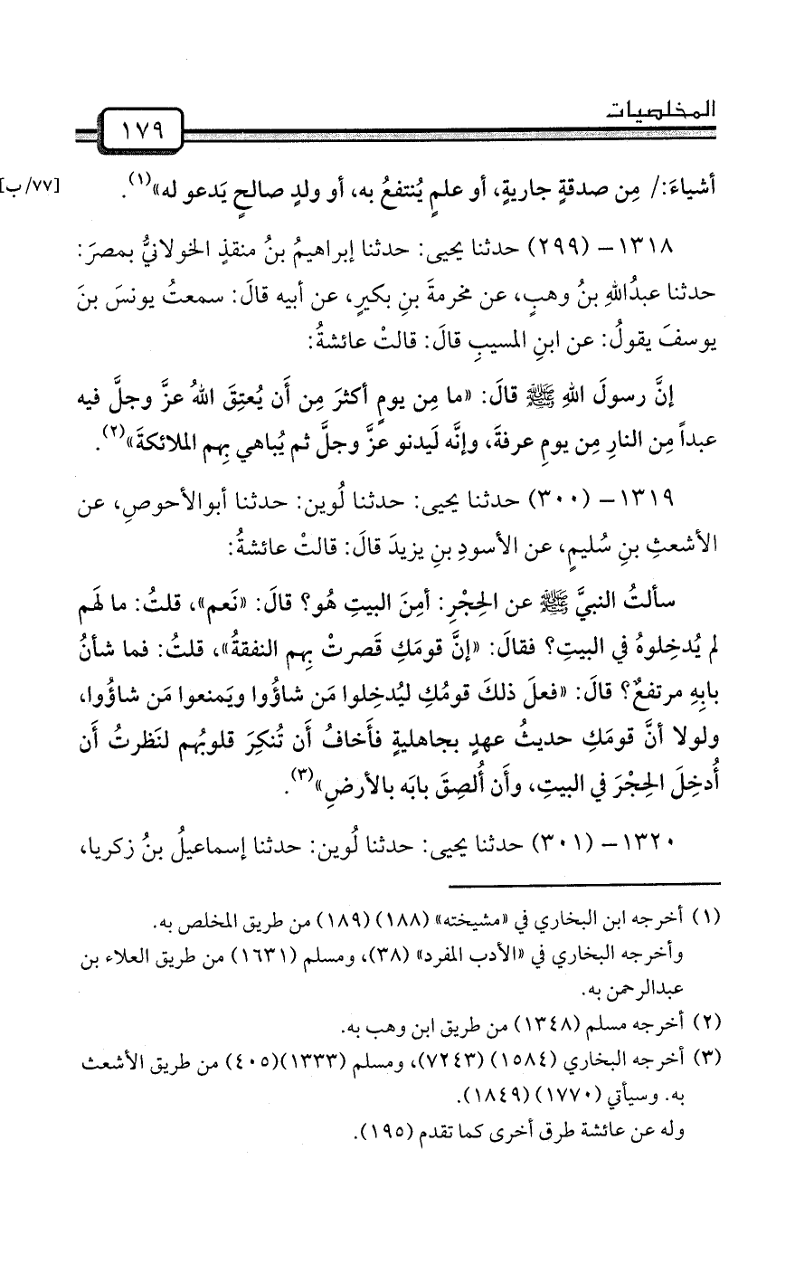 1318- (299) حدثنا يحيى: حدثنا إبراهيمُ بنُ منقذٍ الخولانيُّ بمصرَ: حدثنا عبدُاللهِ بنُ وهبٍ، عن مخرمةَ بنِ بكيرٍ، عن أبيه قالَ: سمعتُ يونسَ بنَ يوسفَ يقولُ: عن ابنِ المسيبِ قالَ: قالتْ عائشةُ: