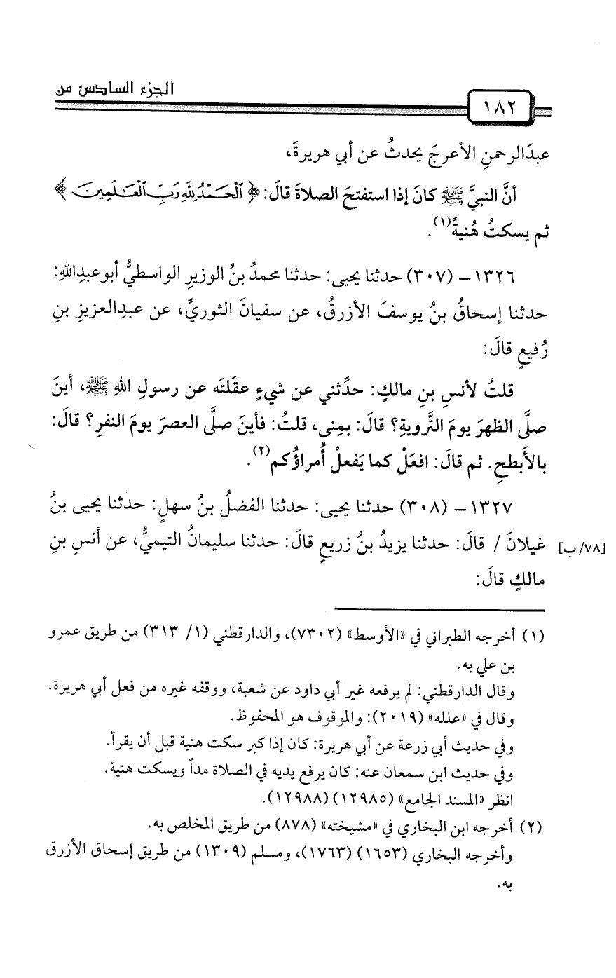 1327- (308) حدثنا يحيى: حدثنا الفضلُ بنُ سهلٍ: حدثنا يحيى بنُ غيلانَ / قالَ: حدثنا يزيدُ بنُ زريعٍ قالَ: حدثنا سليمانُ التيميُّ، عن أنسِ بنِ مالكٍ قالَ:
